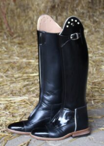 Boven: Prestige 41 57 38 met 8 cm dressuurboog, vleugel sierkap, gesp en sierneus in lak van €750 voor €450. Rechts: Polo 41 55 40 blauw lak met 8cm boog (dus 47 cm achter de knie) en houtlookzool van €660 voor €425.